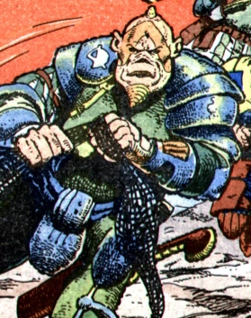 Black Gumbs was the leader of the Slavers of Drule, feared throughout space...until they made the mistake of kidnapping the family of Eleanor Kreeble, who hired Strontium Dogs Johnny Alpha and Wulf Sternhammer to retrieve them! Johnny picked off most of the slavers, then, when Black Gumbs attempted to escape on his ship, blew up the ship with Gumbs on board it.