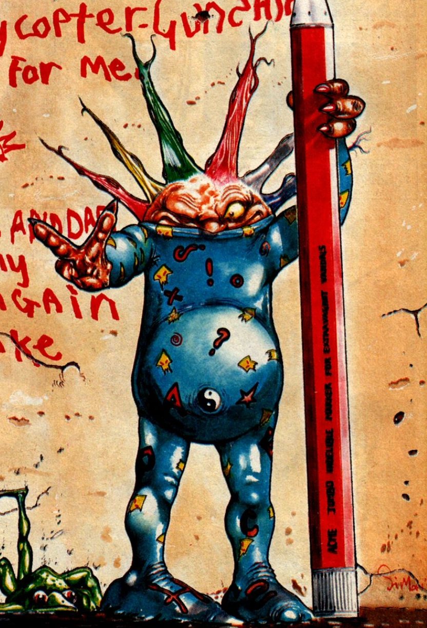 Bradley was a 2000 AD strip about a diabolically ill-behaved alien infant called Bradley, who first appeared in one of Tharg's Future Shocks before graduating to his own strip. Some of his stories were parodies of the 'Rupert Bear' format, where monotonous lines of square pictures are described in short paragraphs of text which are summarised in twee little rhyming couplets. Pictured is the wunderkind standing next to a graffito he has drawn. He also set a fiendish trap for elderly philanthropist Father Christmas.