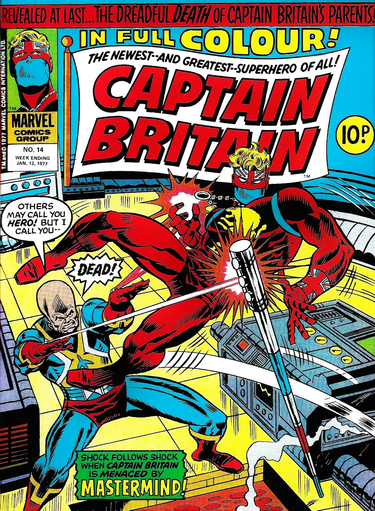 In the basement of Braddock Manor, Brian fights a gigantic bald man who wears his underpants outside his trousers and calls himself Mastermind. Finding that his wrist laser cannot penetrate Captain Britain's forcefield, Mastermind proposes that they both drop their weapons. During the ensuing truce, Mastermind shows the young man video footage of how his parents died. Mastermind electrocuted them both while Brian was busy canoodling with Valerie Campbell, his then girlfriend. He manages to persuade Brian that his parents' death was his fault, because if he'd been in the house as well then he could have given them first aid or phoned for an ambulance. This, in fact, is nonsense, because if Brian had been there then he might have died instead of his parents, and if he'd survived it is far from certain that any sort of medical attention would have caused his parents to miraculously recover from being electrocuted. However, Brian is so conscientious that Mastermind's accusation leaves him racked with guilt and begging the computer to kill him.