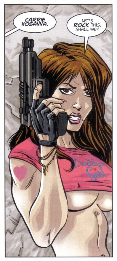Carrie Hosanna was once the wife of gunshark Finnigan Sinister, but things didn't work out between them, mostly because they're both fiery tempered and often homicidal. She went on to become the Queen Empress of the Yakuza, leader of the Mangapore Clans. There are, however, still unresolved feelings between her and Finnigan.