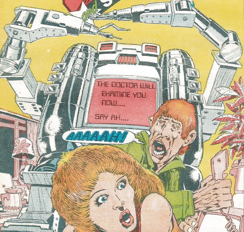 Doctor Feeleygood is a character from the Starlord and 2000 AD strip Ro-Busters. He was a dangerously unhinged robot medic who was taken out of service as a result of several... unfortunate... incidents after which patients had cause to regret allowing him to treat them, and sold to Howard Quartz's robot disaster squad, Ro-Busters. He was accompanied by his robotic practice patient, Casey, who lived in constant dread of the Doctor deciding to test out a new procedure on him. Feeleygood was one of the Ro-Busters members who escaped being scrapped by Quartz and fled to the free robot world of Saturn Six along with Ro-Jaws and Hammerstein.