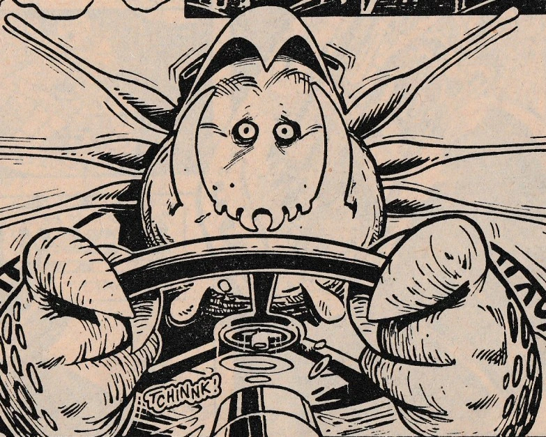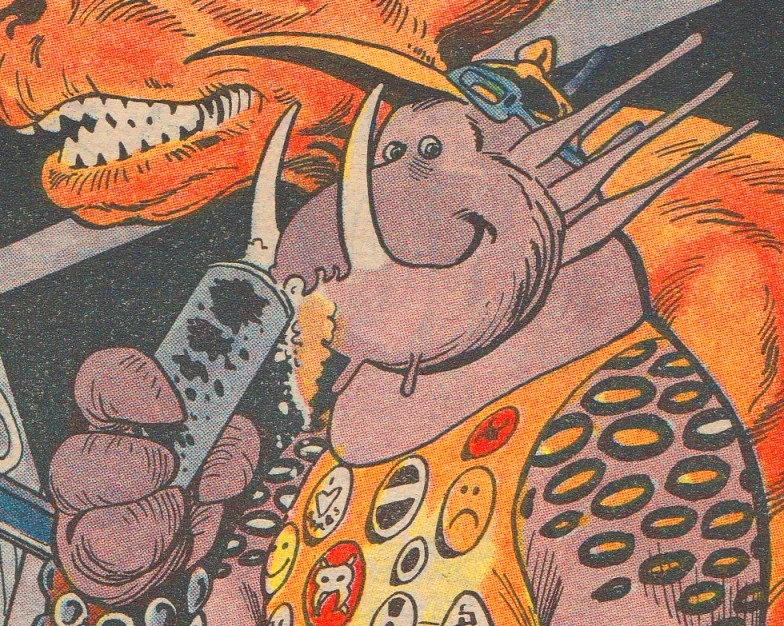 Quinch, D.R., Chrysoprasia and Pulger (who had survived his encounter with the snufflegruff) ended up trapped between two opposing armies. Just as all seemed lost a brilliant light shone from the heavens and an enormous spaceship descended. The hatchway opened and what D.R. called an "unbelievably disgusting" being composed of a skyscraper-sized "quivering mass" with "huge, blubbery lips" emerged, crushing the belligerent soldiers. It was Quinch's mother, summoned by a letter from D.R. She whisked the four friends away in her "cosy inter-cosmic mega-palace", treating them to tea, scones and, for Quinch, a haunch of meat bigger than his head. It was an incredibly moving demonstration of the power of maternal love.