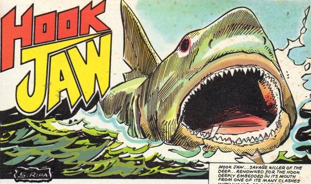 The eponymous protagonist of the Action strip Hook Jaw was a shark with a harpoon stuck through his jaw, a souvenir of a brief encounter with a foolhardy fisherman called Al who quickly became called lunch. Hence 'Hook Jaw'. Hook. Jaw. Get it? Hook Jaw's career consisted of eating a surprising number of people in a few short years between 1977 and 1985. He returned in 2016, in his own Titan Comics five issue miniseries written by Simon Spurrier and drawn by Conor Boyle, and later showed up in 2000 AD in September 2020.