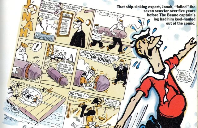 (8th June 1963). The main character was a gormless sailor, who was feared and shunned wherever he went because he somehow managed to accidentally sink every ship he sailed on. Jonah is generally regarded as one of Reid's finest creations, and Reid himself declared it to be his favourite out of all the strips he drew for the Beano. After Jonah was dropped, Reid started drawing a new story about Jonah's schoolgirl sister, Jinx, although her run in the comic was curtailed when Reid left D.C. Thomson just a year later.