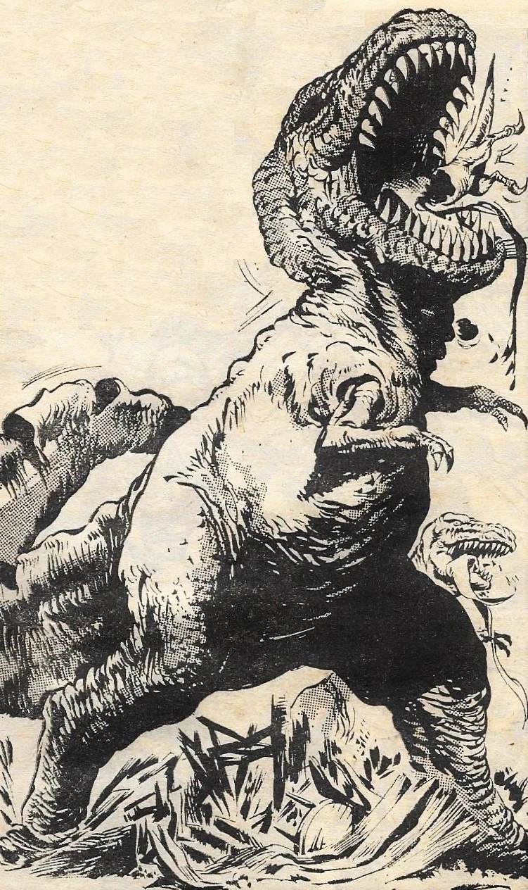 A different tyrannosaur bit Reagan's friend Joe Brontowski, causing him to develop a high fever. When he was lying close to death, Reagan cut a gland out of Old One Eye's neck (she was busy destroying Carver City, the colony ruled by the villainous Claw Carver, at the time), and a doctor used it to make a medicine that cured Joe.