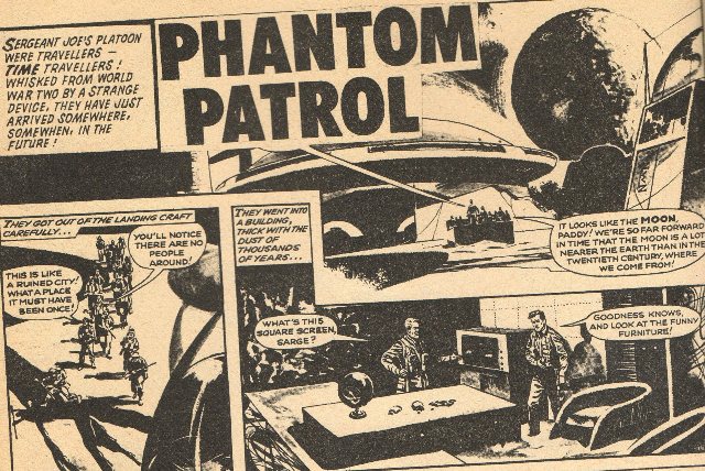 Phantom Patrol was a strip which originally ran in Swift, although segments of it have since been reprinted in several titles including 2000 AD and Starlord annuals. It concerned a British infantry patrol from 1941 led by Sergeant Joe Timm and including several others such as Corporal Jock McLuckie and Private Paddy O'Connell, who accidentally stumble upon a time machine in a crashed UFO in Crete and find themselves hurled back through time into a series of bizarre adventures. Along the way, they gain allies in the robot dog Fergus and future cop Cornelius Kerrigan. The strip was drawn by Gerry Embleton and written by Willie Patterson.
