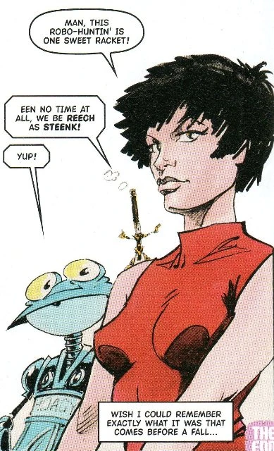 Samantha Slade, a character from the 2000 AD strip Robo-Hunter, is the estranged granddaughter of former robo-hunter Sam C Slade. Despite growing up with little contact with her grandfather, since 'inheriting' his two former robot assistants Hoagy and Stogie she has found herself carrying on the family business as a hunter of rogue robots.