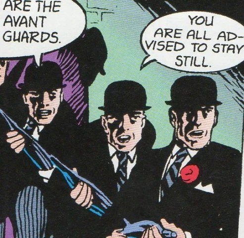 Saturnyne employed the Avant Guards, a group of operatives who acted as her personal guard. For some reason, they all wore business suits and bowler hats and carried guns disguised as umbrellas.