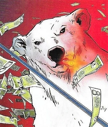 Shuggy Bear is a polar bear with artificially augmented human-level intelligence and the power of speech, a former experimental subject freed by the 'Dredd Act'. He now runs a shuggy hall (shuggy being a 22nd century variant of billiards) and is an associate of Lenny Zero and Max Normal. Shuggy Bear financed Lenny Zero's audacious scheme to steal over a billion creds from Justice Department, with the help of Normal, Orlok's satellat, a psychic called Mink and a DJ called Afro Dizzy. The plan was successful, but all the money was then stolen from the gang by a sentient ATM called Johnny Cash, who used it to escape to a paradise planet with no extradition treaty. Shuggy Bear was sanguine in the face of this unexpected disaster.