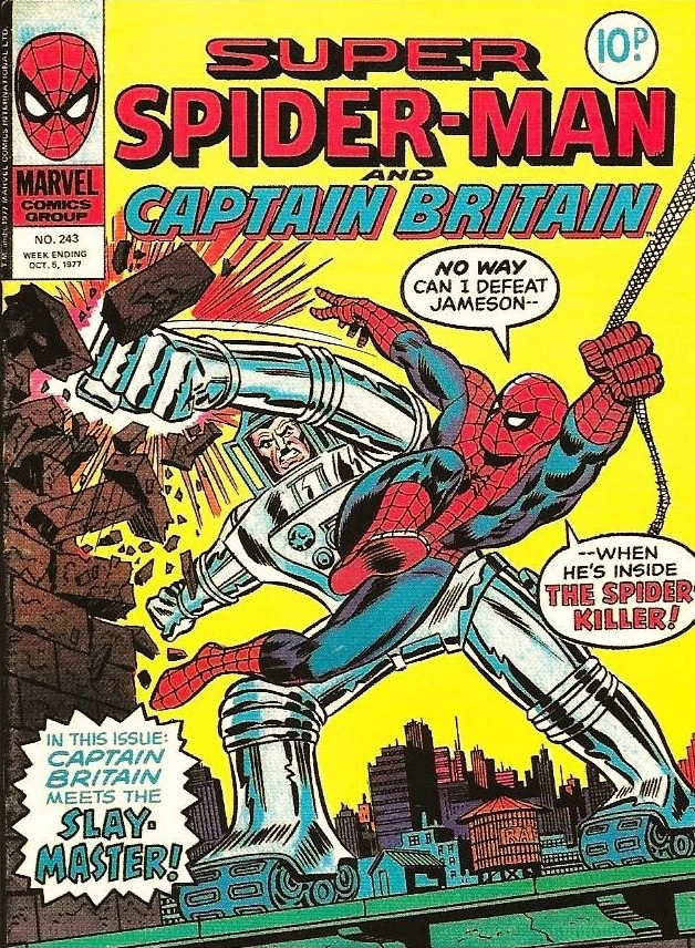 Captain Britain hears a scream as Sir Thurlow Archer, who collected rare weapons, is shot through the heart by an arrow in his flat. He flies to the scene. The Slaymaster, pretending to be the victim's daughter, tricks Captain Britain being knocked out. The police, led by Dai Thomas, arrive at the flat and arrest Captain Britain on suspicion of killing Sir Thurlow Archer. He breaks the handcuffs and flies away. In Betsy Braddock's modelling studio, Brian reads a newspaper and discovers that the person who killed Sir Thurlow with an arrow is a serial killer targeting collectors. He goes to Jamie's race track to ask him about a previous victim for whom Jamie had worked. Jamie tells him that that man had collected horses, and that there is another collector on the track right now: Major Jock Gunn, who collects racing cars. Major Gunn is just about to fire the starting pistol. Brian has a bad feeling about this and changes into Captain Britain, but is too late to stop the starting pistol from exploding. It kills Major Gunn and renders Captain Britain unconscious.