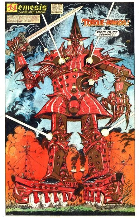 Torquearmada: "With sword and axe and mace, I cleanse and purify... I never show any mercy... All aliens must die!" 2000 AD prog 342.