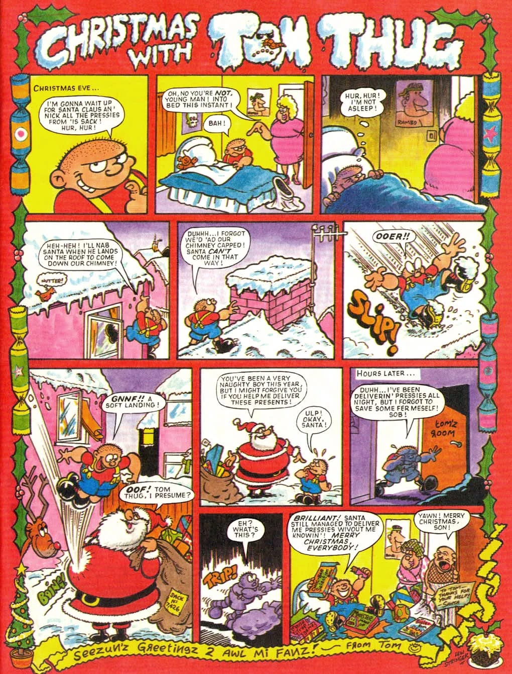 Tom Thug was a long running humour strip by Lew Stringer which began in Oink in May 1986 before later transferring to Buster in 1988 when Oink! was cancelled (at this point, the strip's title changed to Tom Thug's Skooldayz). Tom Thug was a boy encouraged by his skinhead father to be a school bully, as he himself had been. Tom, however, was so thick that he could never get anything right, so his attemmpts at being a bully usually backfired on him. The strip continued in Buster until the comics final issue in December 1999/January 2000, although the last couple of years contained reprints of earlier material. The final issue contained an all-new Tom Thug strip, in which Tom, who had always been proud of his ignorance, was disappointed to learn that he had passed all his exams.