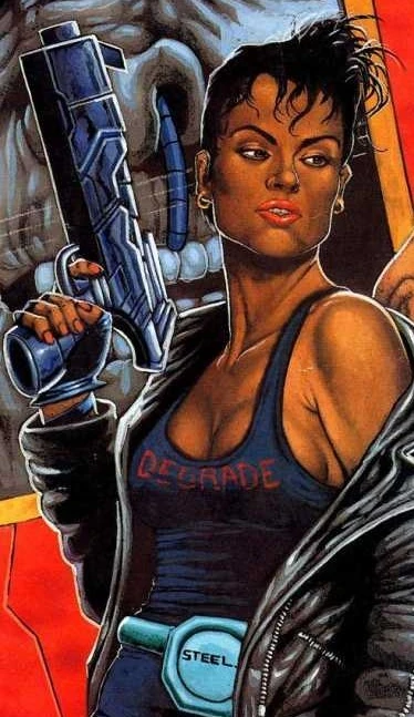 Treasure Steel is a supporting character from the Judge Dredd Megazine strip Armitage who sometimes has her own strip. A veteran Detective Judge in Brit-Cit, she is the longtime partner of Detective Judge Armitage, being one of the few people alive who can actually stand him. Unlike Armitage, Treasure is a generally fairly relaxed and positive person, though you wouldn't want to get on the wrong side of her.