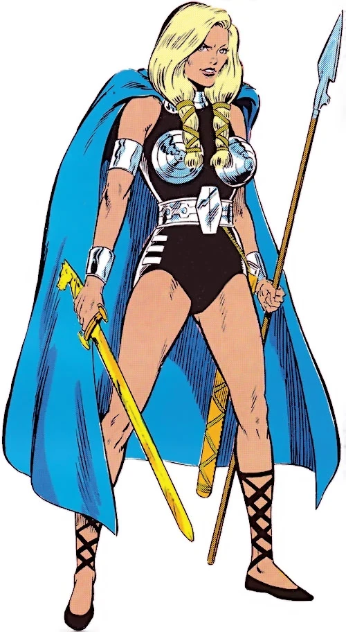Brunnhilde was one of the Valkyrior, Odin's choosers of the slain, centuries ago. Falling foul of the Asgardian Enchantress, she lost her memories of her real self and became a pawn of the villainess. the Enchantress took on the Valkyrie's form to bedevil the Avengers, and Brunnhilde was later merged briefly with the mortal Samantha Parrington and fought the Hulk (Bruce Banner). Eventually, after having her essence merged by the Enchantress with the insane Barbara Norris, the Valkyrie broke free of the Enchantress's control and joined the Defenders in thwarting her schemes. Afterwards, she remained with the group, inheriting the Black Knight's winged horse, Aragorn, along the way. Her life was for quite some time complicated by the presence of Barbara Norris's husband, Jack, who could not believe that "Val" wasn't really Barbara.