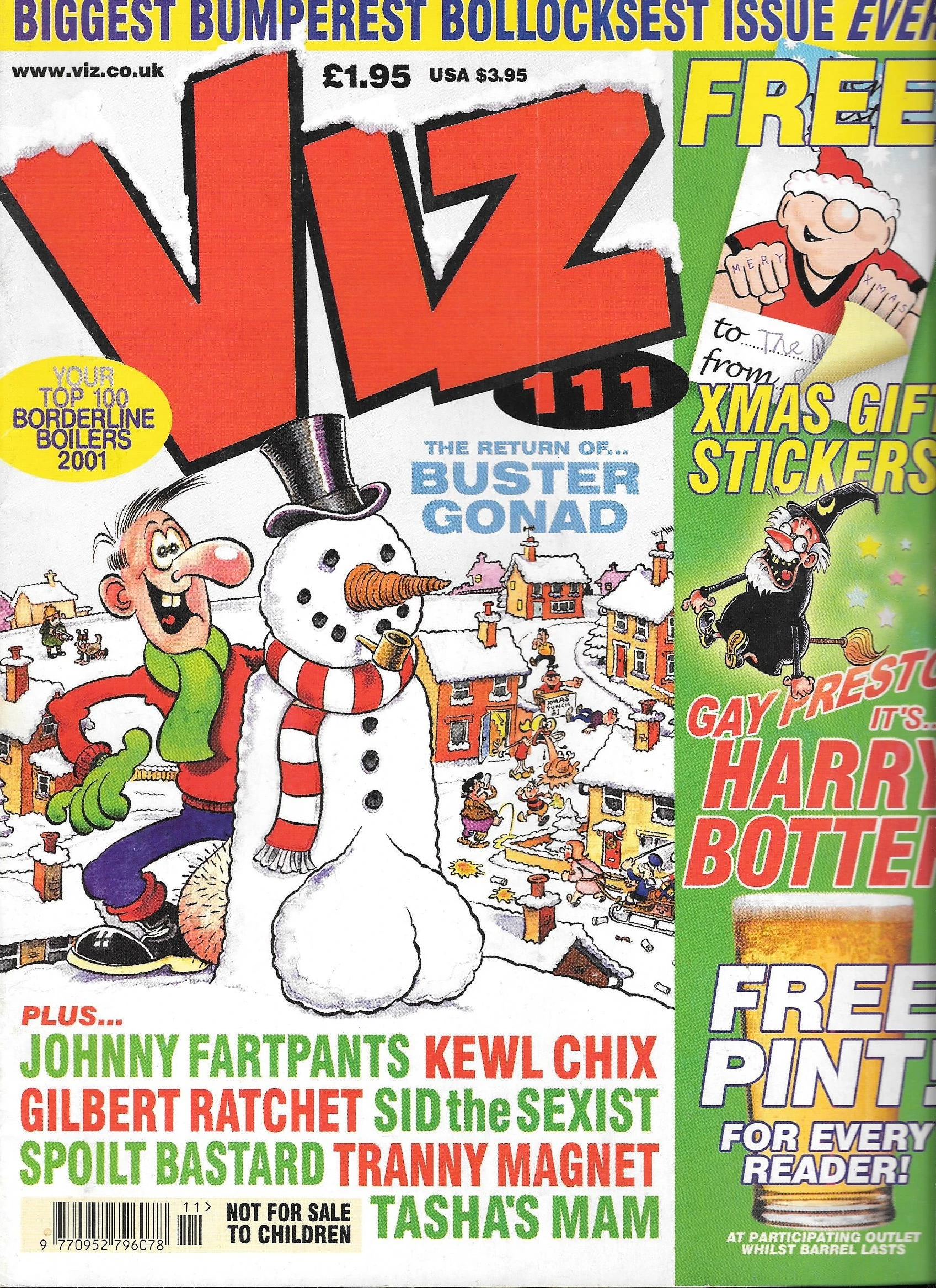 Viz is a humour comic founded in 1979 by Chris Donald, which parodies traditional juvenile humour comics such as Beano and Dandy but is aimed firmly at an adult audience, using extreme bad language, violence and sexual situations for comedic effect. It also spoofs tabloid newspapers, with mocked-up letters pages and fake competitions and advertisements, and takes satirical swipes at current events. It enjoyed huge success in the 1990s in particular, at one point being one of the most popular magazines in the UK. Popular strips include foul-mouthed TV presenter Roger Mellie, the Man on the Telly; The Fat Slags; Biffa Bacon; Billy the Fish and Sid the Sexist.