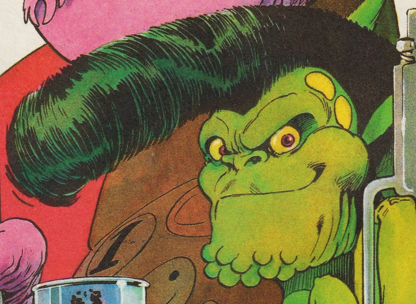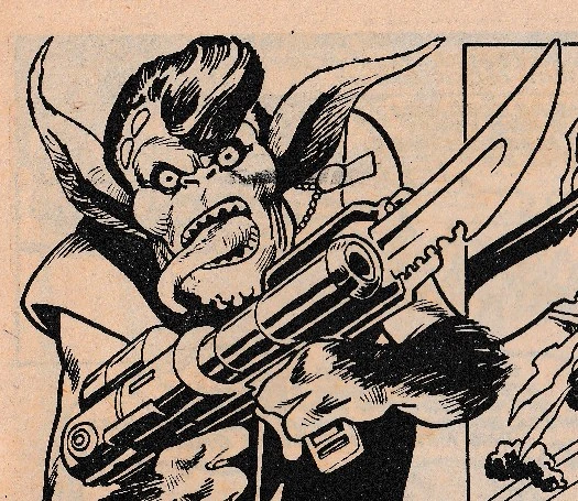 In 'D.R. & Quinch Get Drafted' (2000 AD progs 355 to 359), D.R. and Quinch were forced to join the army. After wandering in the slime jungles for hours they gunned down a bunch of soldiers, which led D.R. to descant movingly on the horrors of a war which forced them to kill a group of young men who bore a remarkable resemblance to their own platoon. The hapless duo were then informed that their victims were, in fact, their own platoon, whom they had accidentally pulverised with a devastating barrage of not-very-friendly fire. D.R. and Quinch ended up locked in a penal stockade on Ghoyogi with Pulger. They escaped via a snufflegruff tunnel but Pulger had to fend off a monstrous, slavering snufflegruff with a gun made of soap while his friends made a run for it. The end of the tunnel brought them to a cell occupied by none other than Chrysoprasia, who had become a mercenary.